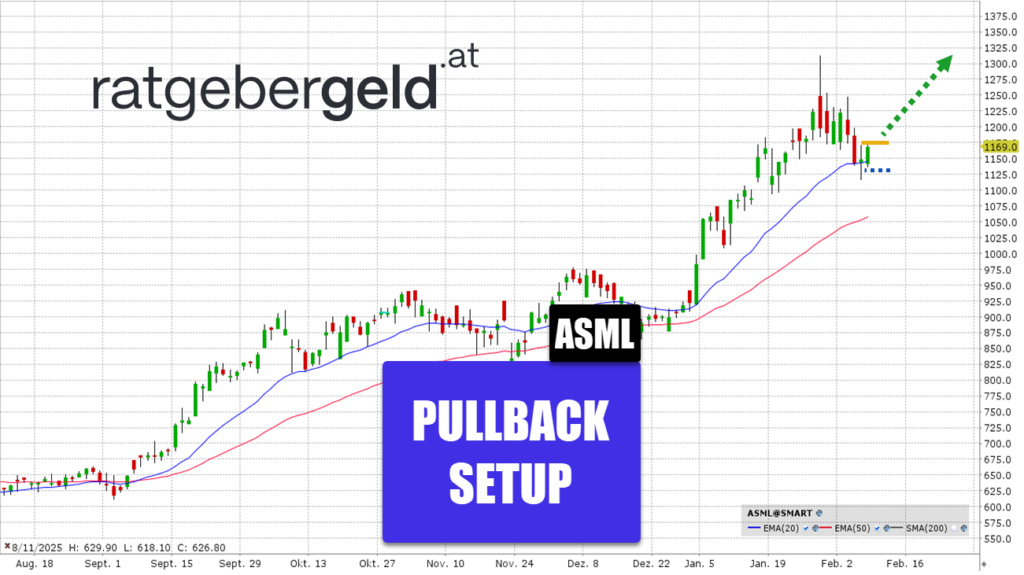 Fundamental ist ASML durch die monopolartige Stellung bei EUV-Systemen und den KI-Hype fast unantastbar. Nach einer starken Rallye sehen wir jetzt aber eine Konsolidierung der Aktie. Der Preis ist auf ein wichtiges Unterstützungsniveau zurückgekommen – die 20-Tagelinie.