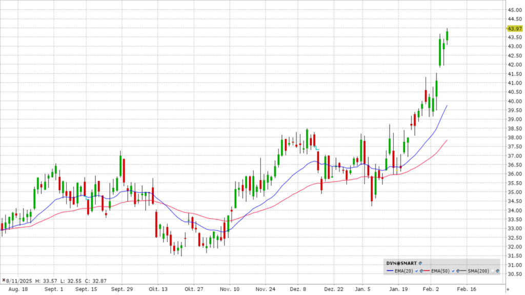 Devon bereitet eine Fusion mit Coterra Energy vor (Abschluss geplant für Q2/2026). Dieser Zusammenschluss im Wert von rund 58 Milliarden USD schafft einen der größten unabhängigen Schieferöl- und Gasproduzenten der USA. Die Aktie ist zuletzt in eine Beschleunigung übergegangen. Vor einem Einstieg sollte man einen Rücksetzer abwarten. Am 17.02. werden frische Quartalszahlen veröffentlicht.