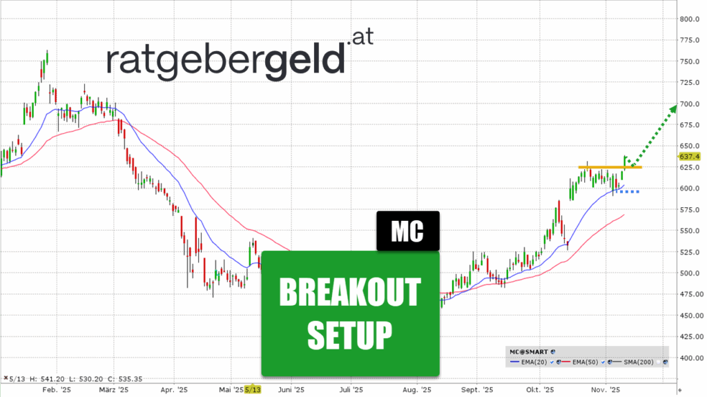 Der Widerstand knapp unter 625 EUR konnte mit einem bullischen Impuls überwunden werden. Temporäre Rücksetzer könnten als Einstiegschancen genutzt werden.