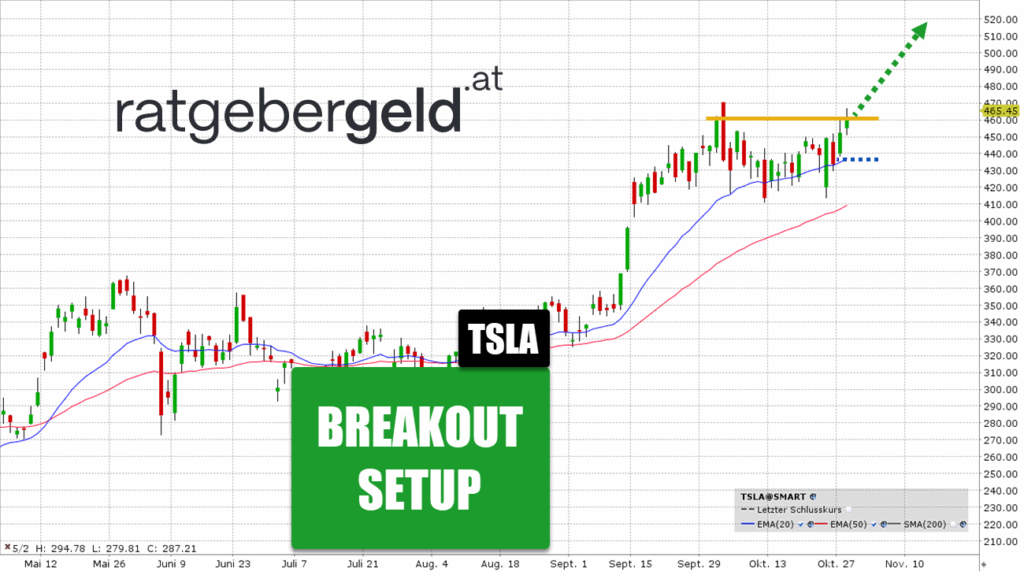 Tesla-Aktie: Chart vom 29.10.2025, Kürzel: TSLA Kurs: 460.55 USD, Tageschart Quelle: TWS
